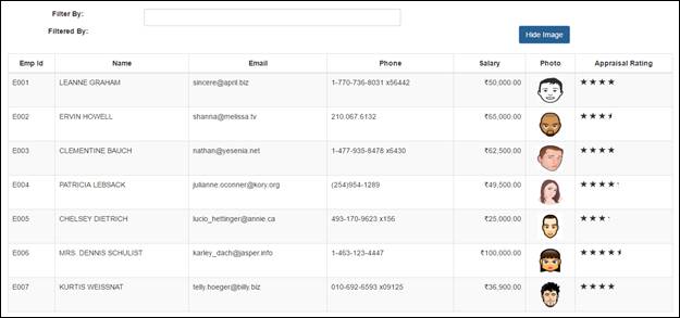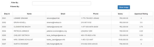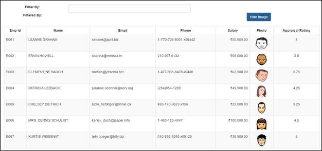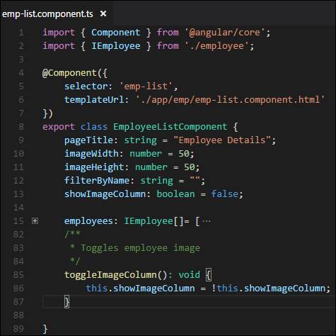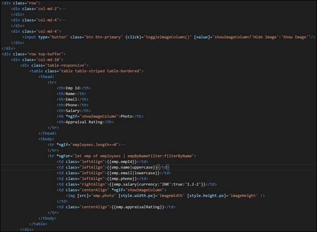 As you can see, we are doing property binding on “value” attribute of button element, by switching the text of the button to “Show Image” or “Hide Image” based on the value of “showImageColumn” property which is declared in our EmployeeListComponent class. Also, we’ve binded the Angular click event to toggleImageColumn() declared in EmployeeListComponent class. We’ve also added *ngIf= “showImageColumn” structural directive to the table head (i.e. th) HTML element as well as to the table data (i.e. td) HTML element.