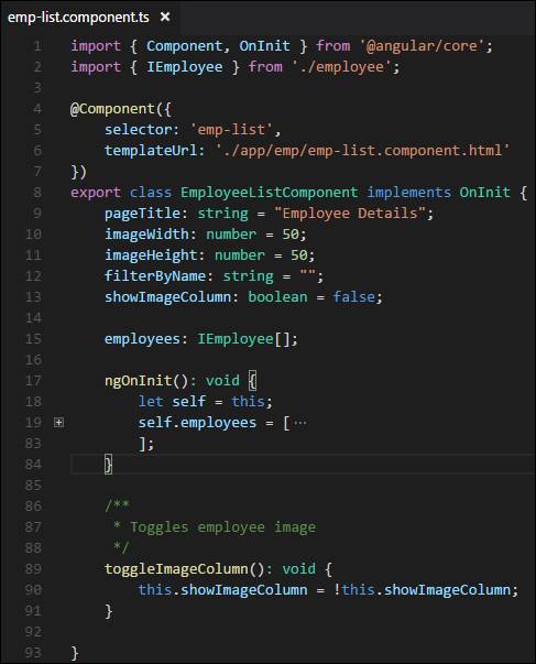 As you can see, we’ve imported the OnInit interface from @angular/core library and implemented on the EmployeeeListComponent class. Inside the class, we provided definition for the ngOnInit method and loaded our employees[] model data there.