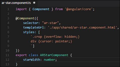 To start with, we’ll first create a shared folder inside our root folder whereby we can put our shared/nested components of the application. Inside the shared folder, I’ve added new TypeScript file named “ar-star.component.ts”. Below is the code snap for the same.