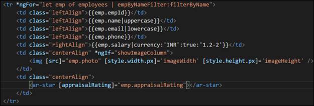 Inside our emp-list.component.html, we are using the newly created ar-star component for displaying the employee appraisal ratings. Below is the code snippet for the same.