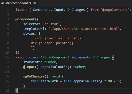 Now, it’s the time for us to pass the data from parent component to child component. To do this, we must have a property in child component decorated with an @Input() decorator. Also, we’ll need to implement OnChange life cycle hook since we need to manipulate the starWidth variable value based on the input appraisalRating value.