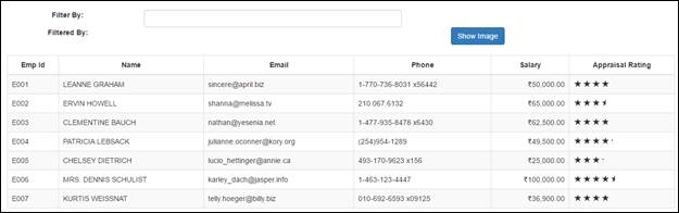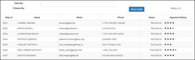 As you can see, I’ve defined eRating property & ratingClickedHandler method which set the value of eRating variable. Here is the updated emp-list.component.html file.
