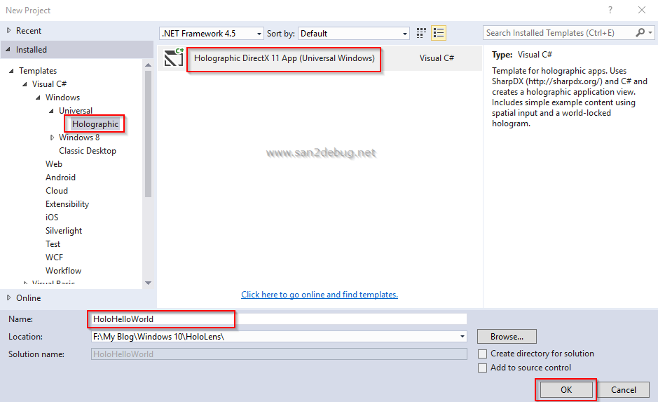 Open Visual Studio 2015. Go to file menu, point to new and then click new project. New Project window will open, you can select an installed template like “ Holographic” under the Windows on Visual C# Template, and then select a Holographic DirectX 11 App (Universal Windows) and type Project Name HoloHelloWorld. Choose the project location path and then click on the OK button.