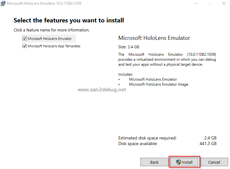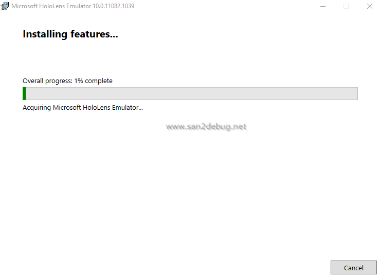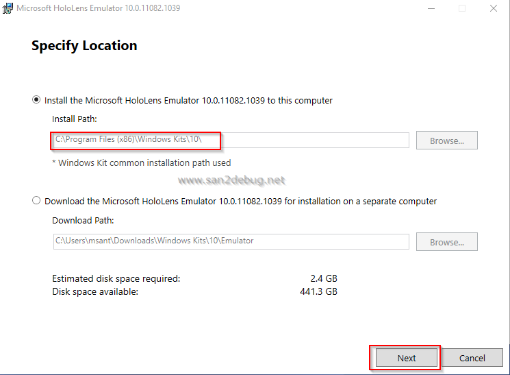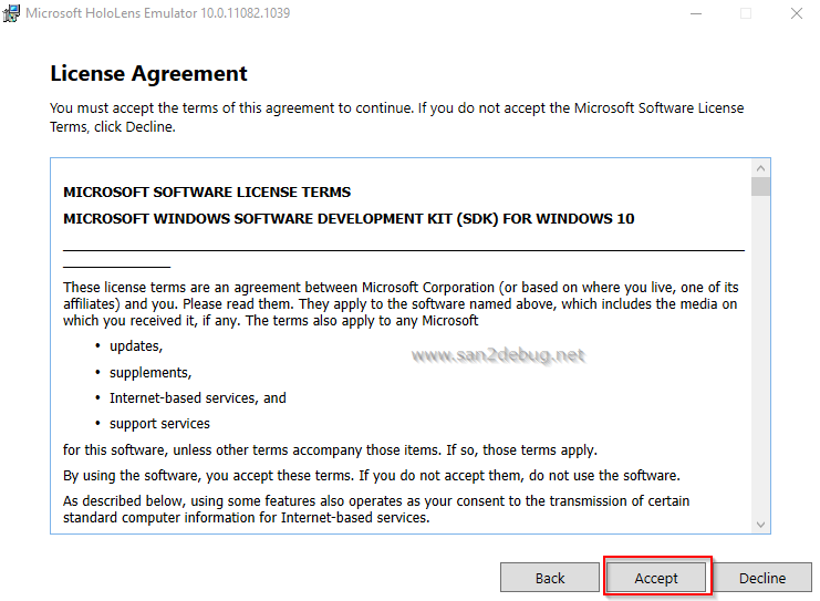 The Microsoft HoloLens Emulator window will open; select a checkbox “Install the Microsoft HoloLens Emulator 10.0.11082.1039 to this computer" then Click Next button.