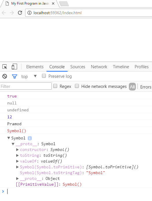 Now, we are done writing our program for "Hello world". Let's talk about data types. JavaScript is dynamic language like any other programming language, so you don't need to declare the type of variable. If I am talking about C, C++, C#, Java etc., you have to define the datatype when you declare the variable.