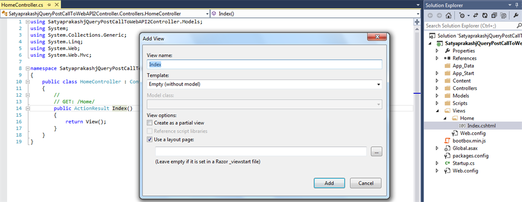 Now, you will need to add one empty Controller along with a View. The View will be used for calling the Web API 2 Controller method using jQuery AJAX. The Controller consists of an empty Action method which then simply returns the View.