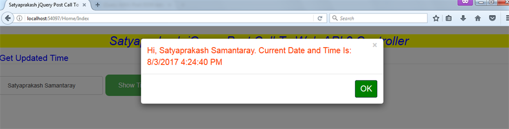 Here, I will show you how jQuery POST Calls to Web API 2 Controller method using jQuery AJAX in ASP.NET MVC Razor. I designed a web page using MVC and put a text box and a button.The text box will be asking your name. By putting your name, when you click on the button, an alert message will show you the current date & time with your name.