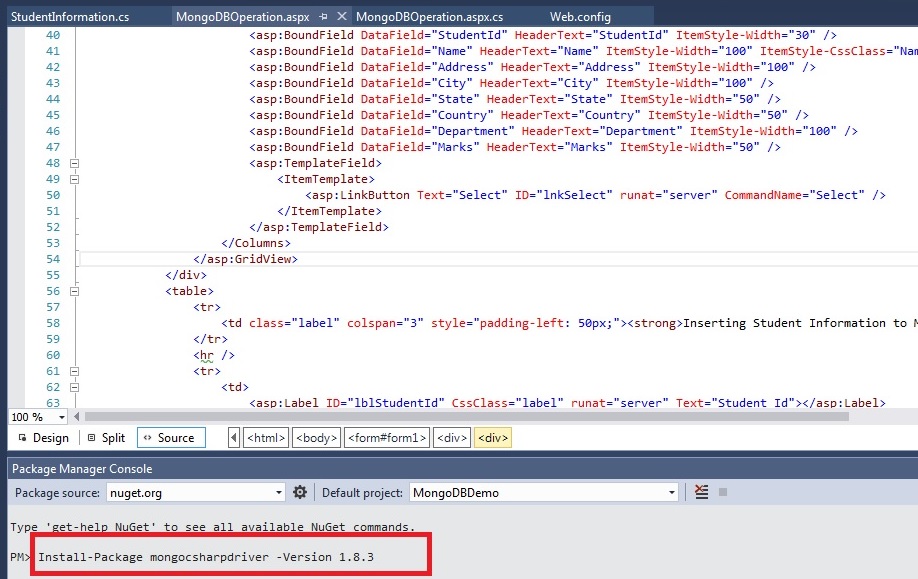 We have createda MongoDB database and inserted some data into it. Let’s create an ASP.NET Web page and see how to do some operations in it.