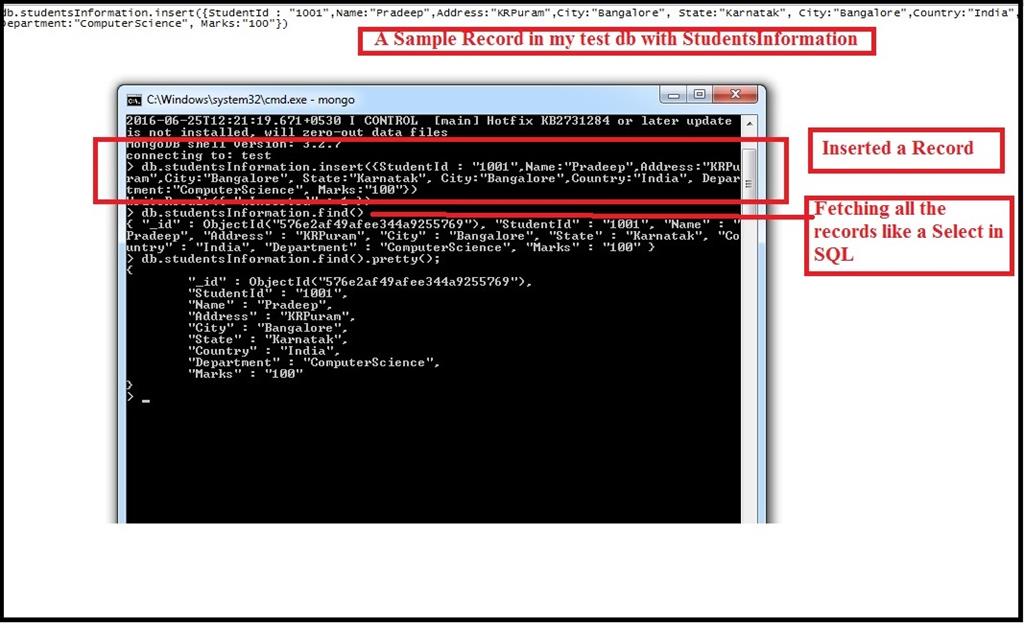 In the test DB, I want to store some information into studentsInformation collection. The insert statement will be as follows:.
