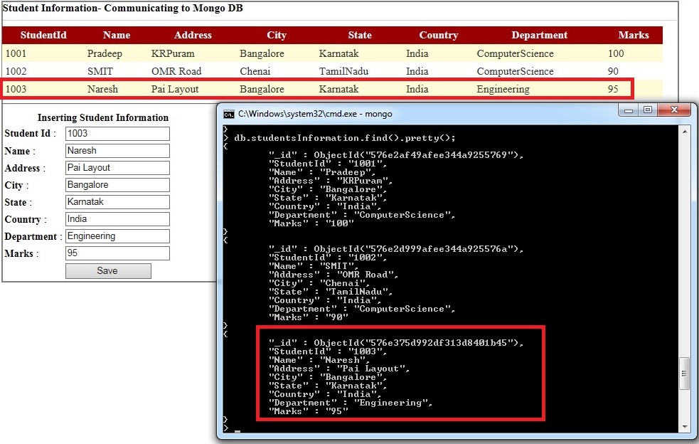 - db.studentsInformation.insert({StudentId : "1002",Name:"SMIT",Address:"45 Main st",City:"Compton", State:"LA",Country:"USA", Department:"CIVIL ENGINEERING", Marks:"90"})