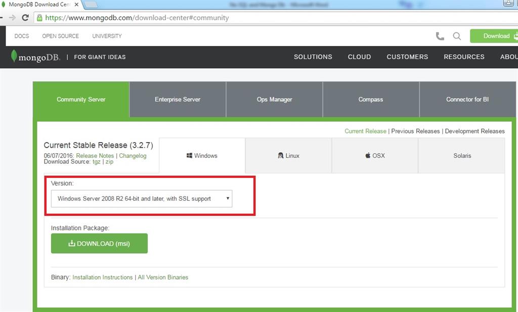 MongoDB is an open source NO SQL Database. The official website for MongoDB is here. To download MongoDB, go to the below URL and download the appropriate version of the operating system you have in your machine.