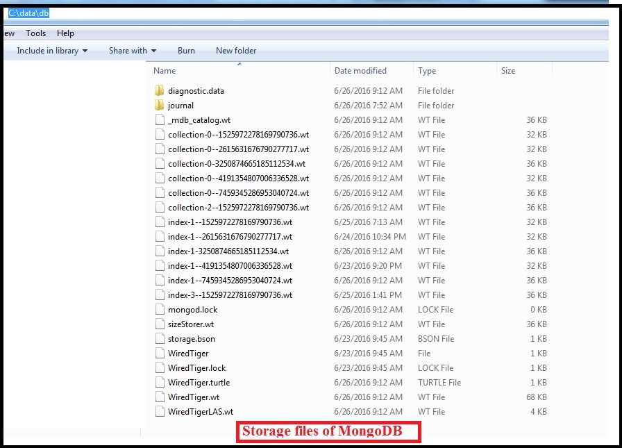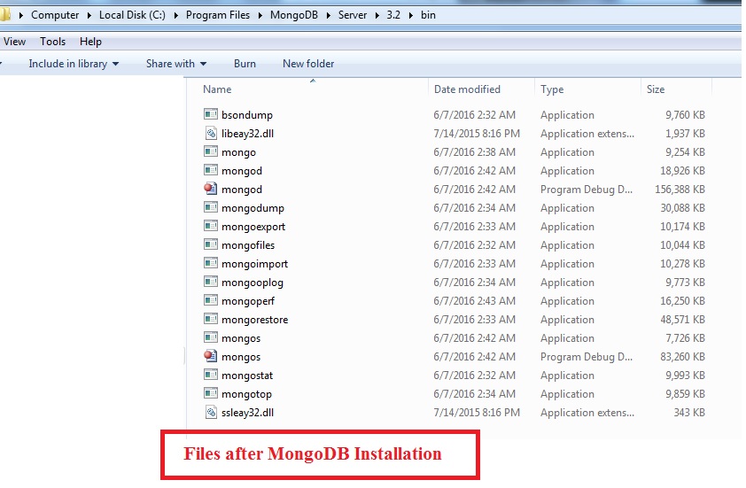 Once you install MongoDB, the folders with the path must have the files, given below: