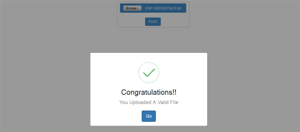 - sweetAlert("Congratulations!!", "You Uploaded A Valid File", "success");