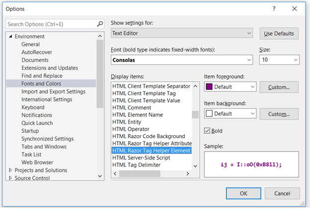 We can customize the font and color of the tag helper from Tools > Options > Environment > Fonts and Colors.