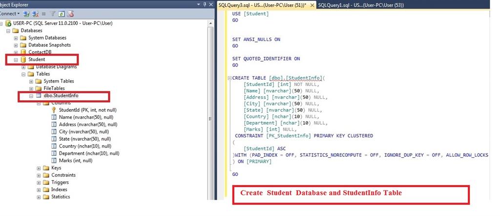 Create a database named Student and create a Table named StudentInfo, as shown below: