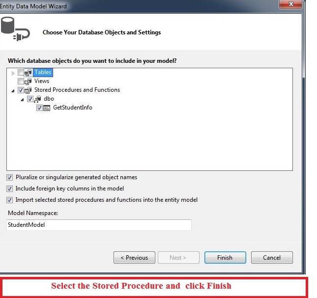 In the next step, we will use the Entity framework, which will call the above stored procedure to retrieve the data from the StudentInfo table.