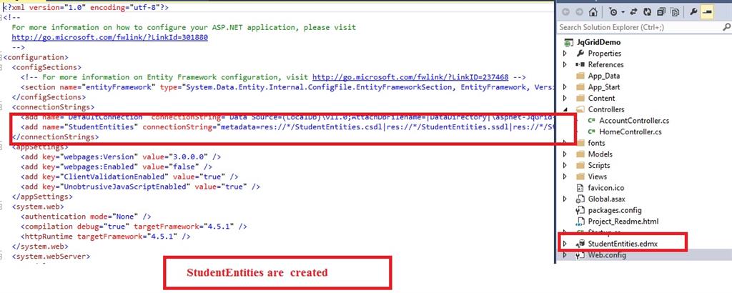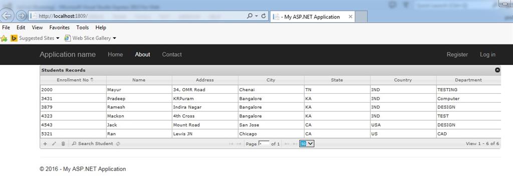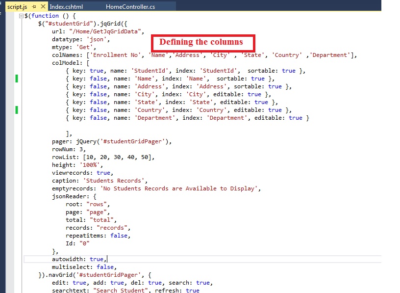 We will be calling by the index action. In the Index view, we have the studentGrid HTML table and studentGridPager as pager in a div and the required scripts for JqGrid.