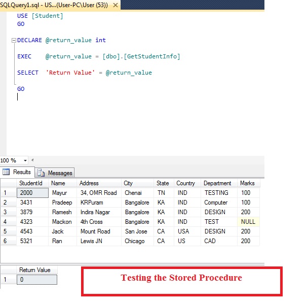 For test purposes, execute the stored procedure and you will get the output, as shown below: