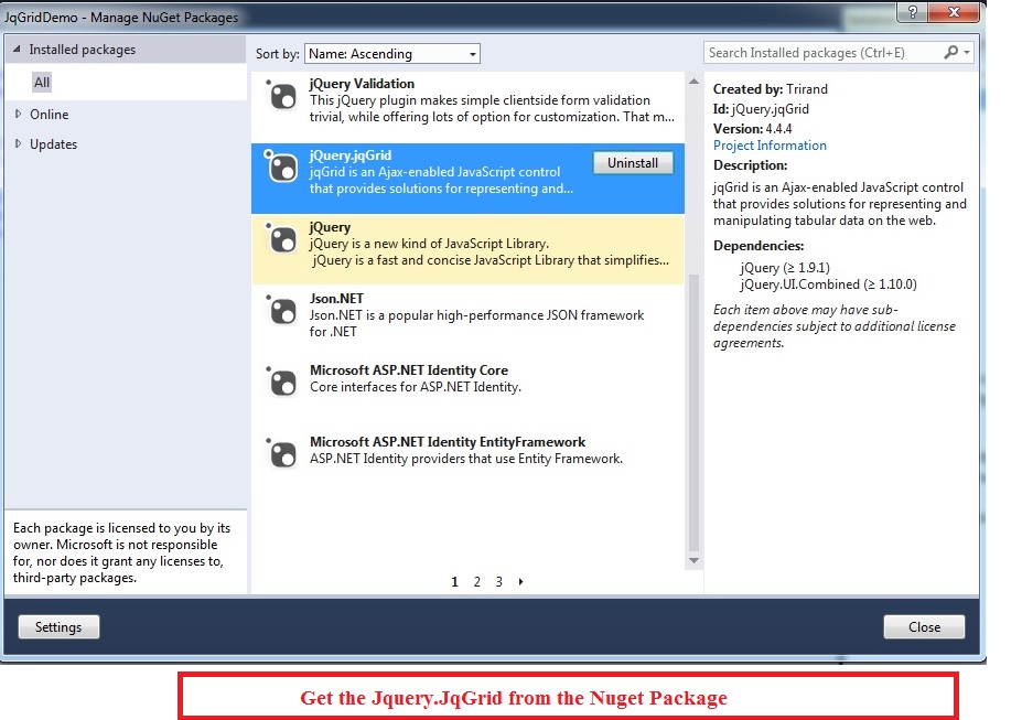 Download the Jquery.JQGrid from the Nuget package, as shown below: