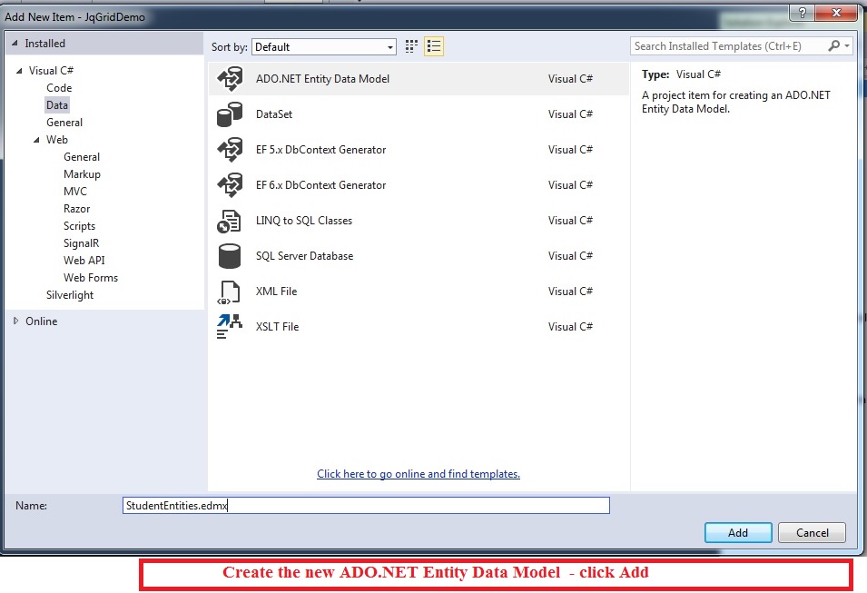 For using Entity framework, we will create an Edmx, as shown below. Go to the project, add new Item, go to the data section and select “ADO.NET Entity Data Model”.