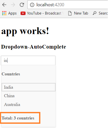 The countrylist array is created, which is used to populate the auto complete control and the selector(app-dropdown-autocomplete) is defined.
