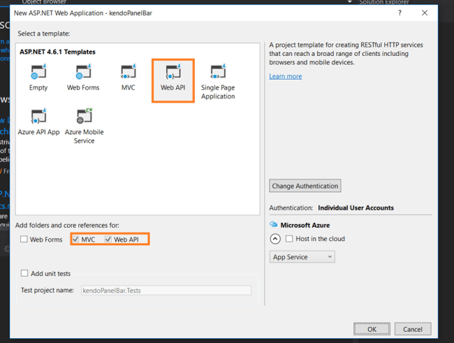 Create a Web API Application, using an installed Web template in Visual Studio, as shown below. In my case, I named the Application “KendoPanelBar".