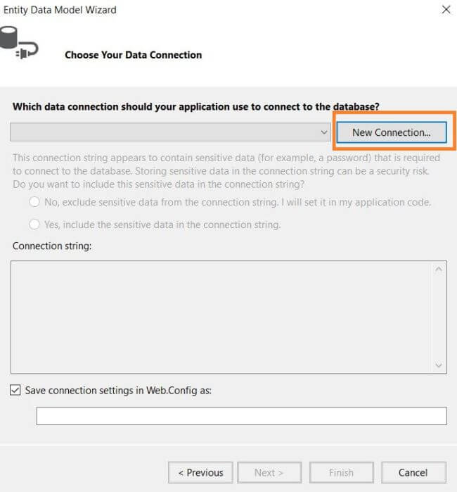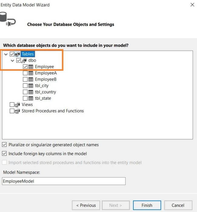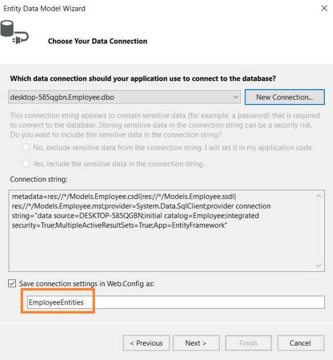 Right-click the Models folder, select Add -> ADO.NET Entity Data Model or select Add->New Item. In the Add New Item Window, select data in the left pane and ADO.NET Entity Data Model from the center pane. Name the new model file. In my case, I made it Employee, and click Add.