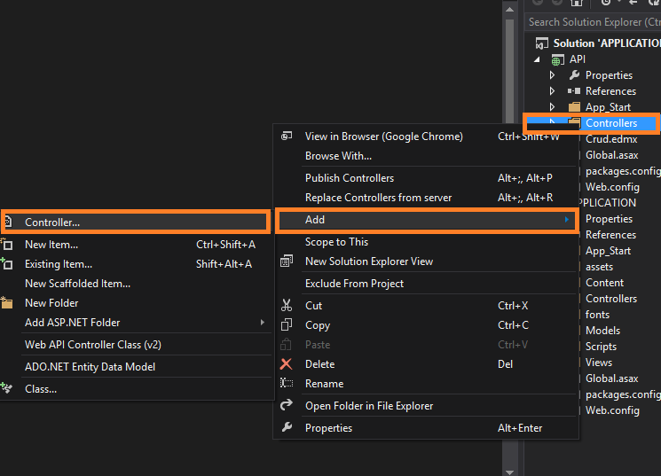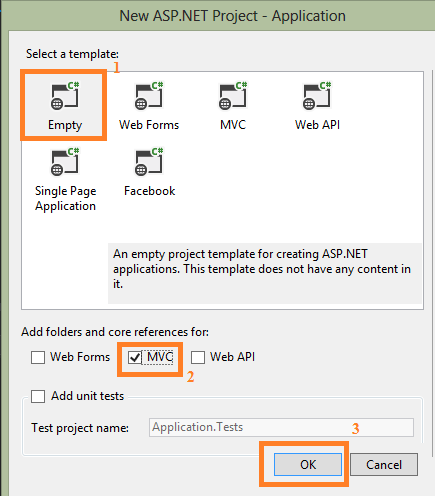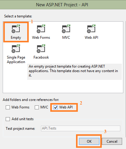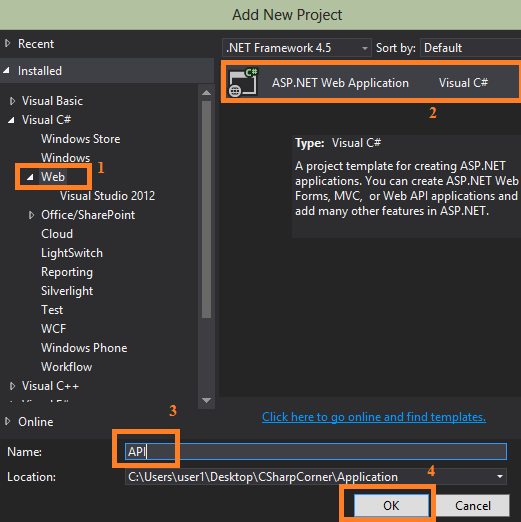 Select New Project -> Web -> ASP.NET Web Application. Name your project (Here, I mentioned it as "API") and click OK. This step is common for MVC, WebAPI, and WebForms.