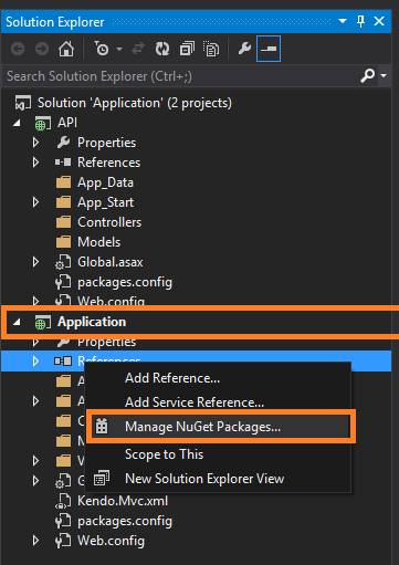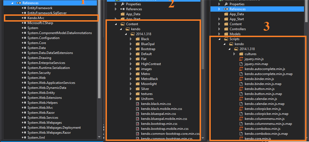 Once you installed the Kendo.MVC into your application, you can see the below screen that the kendo.MVC is added to your reference and predefined CSS and script files are added to your project under content and script folder.
