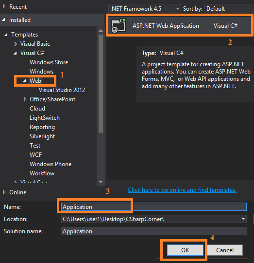 Select New Project -> Visual C# -> Web -> ASP.NET Web Application and enter your application name. Here, I named it "Application". Now, click OK.