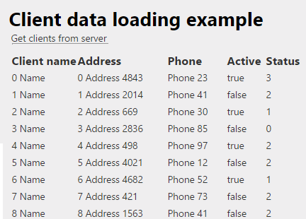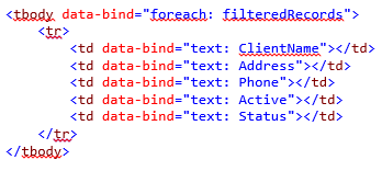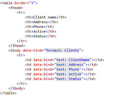 To display the data, we need to hook up some html controls and bind the Knockout array. Create a simple table, and use the “for each” binding to fill it with Client detail data.
