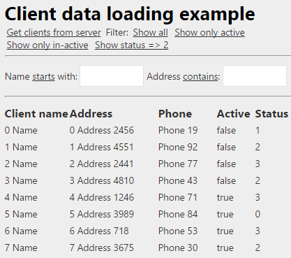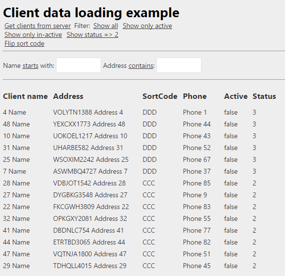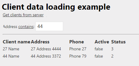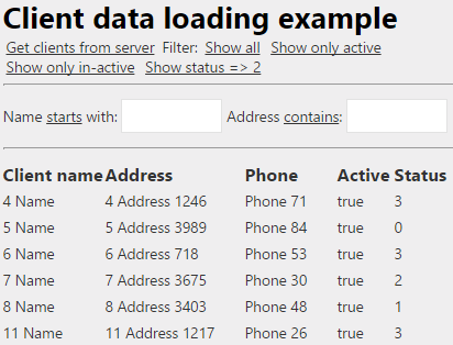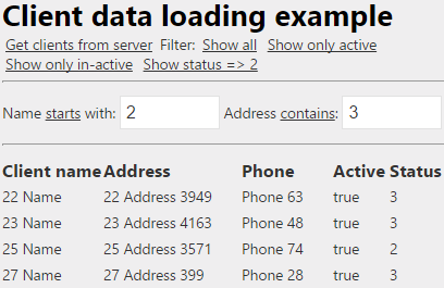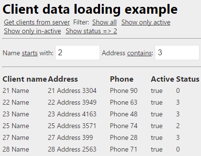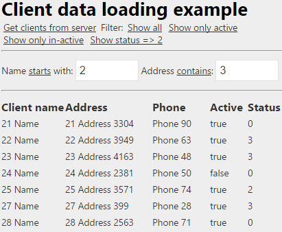 Now that we know how the basics of search works, we can quickly build up a powerful combined search and filter functionality. We will add functionality to allow the user to search on the first part of the Client.Name, the Client.Address as before, and also filter to show within that search, only Active or Inactive client records, or those with a status value, say greater or equal to two.