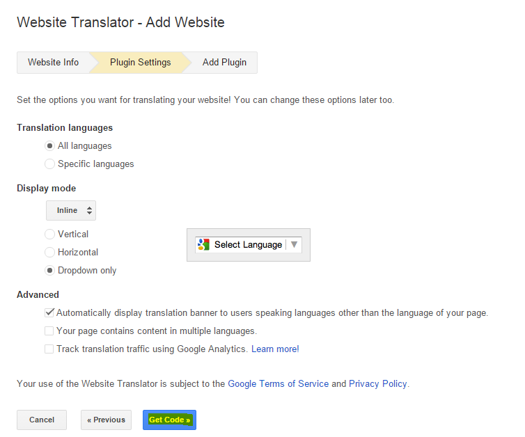 STEP 6: Click on getCode to get the code and copy paste the code where you want to show the Language converter on your website.