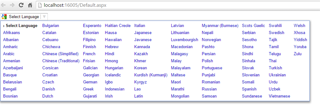 Save the following code and run the website. It will populate a dropdown with the following language options.