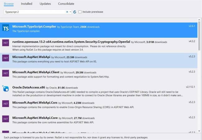 For installing TypeScript we can download the latest version of typescript either by using command line argument using node js or if we use Visual Studio then we can directly download it from Nuget Package Manager.