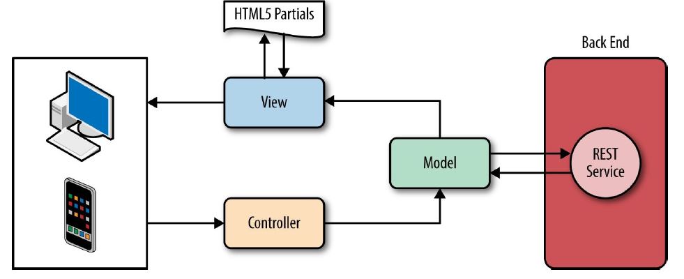 AngularJS makes the process even more faster and easier. Angular JS helps us to develop the frontend UI in a small time with proper support of unit testing for the client side code. Models and views in AngularJS are much simpler that what you find in most Javascript client side frameworks. Controllers, often missing in other javascript frameworks are likely most functional components in Angular JS. Once the AngularJS application is launched, the model, view, controller and all HTML documents are loaded on user’s device and completely run on the user’s hardware. As per the below diagram, we can see that calls are made to the backend REST services, where all business logic and business processes are loaded. The backend REST service can be located on any server either it is a private web server or a cloud server.
