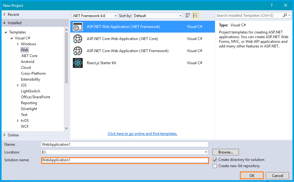 Go to Menu, click New->New project ->select Visual C# under templates-> ASP.NET Web Application.