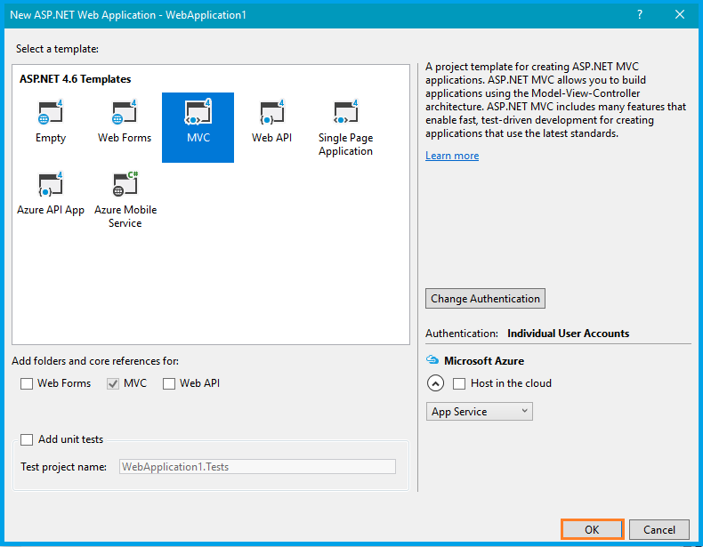 Once you click OK button, one more window opens. Select MVC.