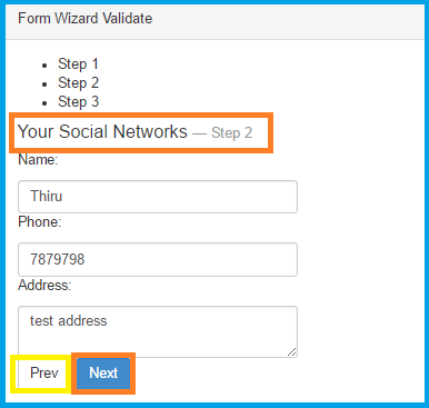 Step 2Once you click "Next" button.you have completed step 1. it will move the step 2. In this step i have used ng-pattern="/^[0-9]+$/" & required key word using for validation .in html form element.