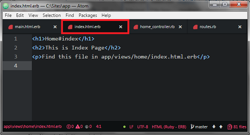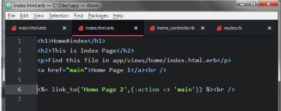 Now we use normal HTML Link method in application.open index.html.erb file in app>>views>>home folder use in atom editor.