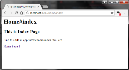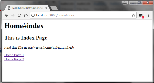 - Above the result you can see ERB link tag named as “Home Page 2” in index page. When you click the ERB link it will go to main page in browser.