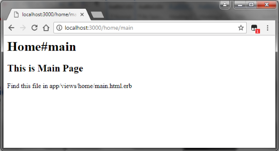 Above the output we can see the normal HTML link tag in the index page, if you like moving to the main.html.erb page, simply click that HTML link and it will go in the main page in browser. The result looks like below.