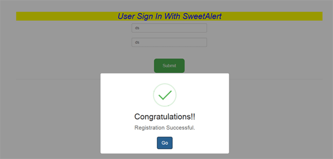 - sweetAlert("Congratulations!!", "Registration Successful.", "success");