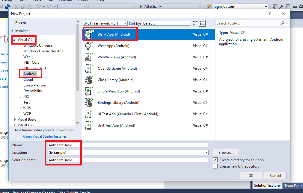 - In the New Project dialog box, under Installed, expand Visual C#, and then click on Android, then select Blank App (Android). In the Name box, type "AuthXamDroid" and click OK.