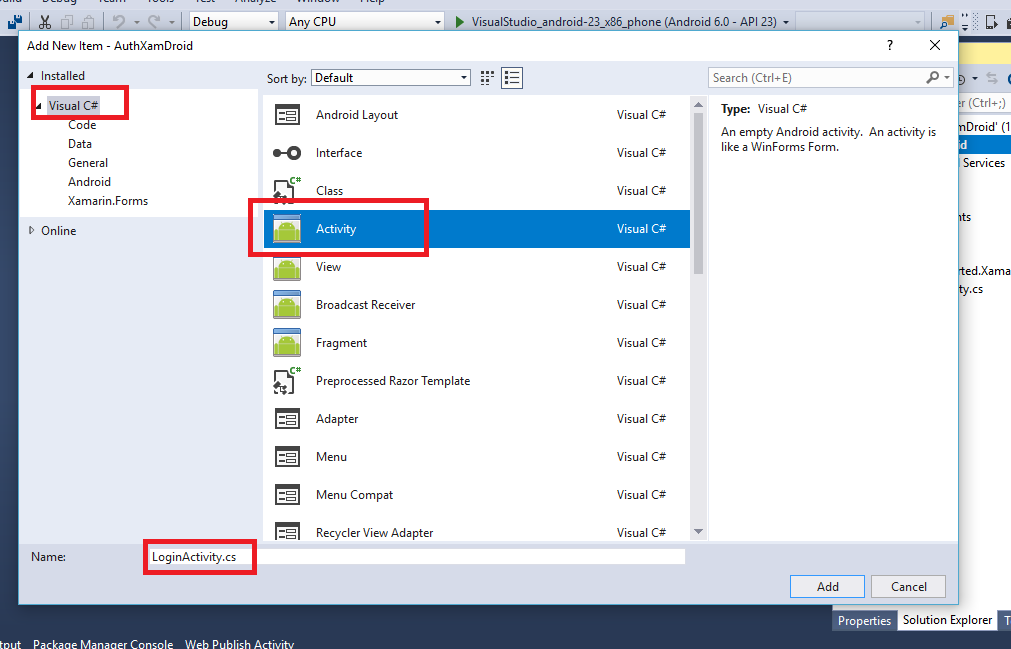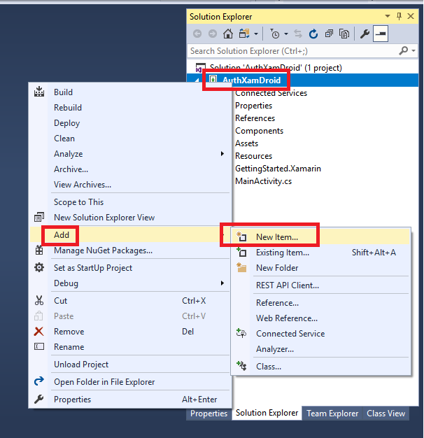- Add a new Activity named as "LoginActivity". Right click on "AuthXamDroid" then click on "Add" and click on "New Item...".