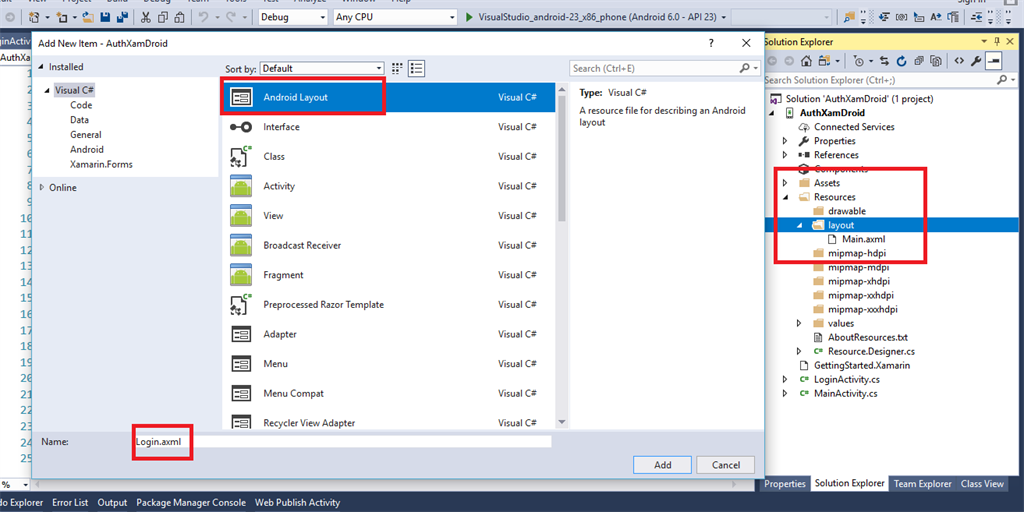 - Same as add a new Layout in "layout folder" under "Resources folder" name it as "Login.axml".