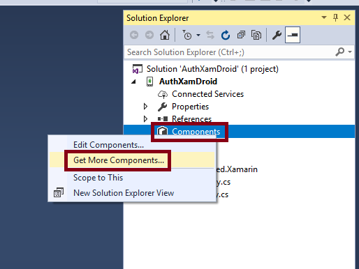 So, first we create our custom theme. For creating a custom theme we need to add "Android Support Design Library". For this right click on "Components" and select "Get More Components..."