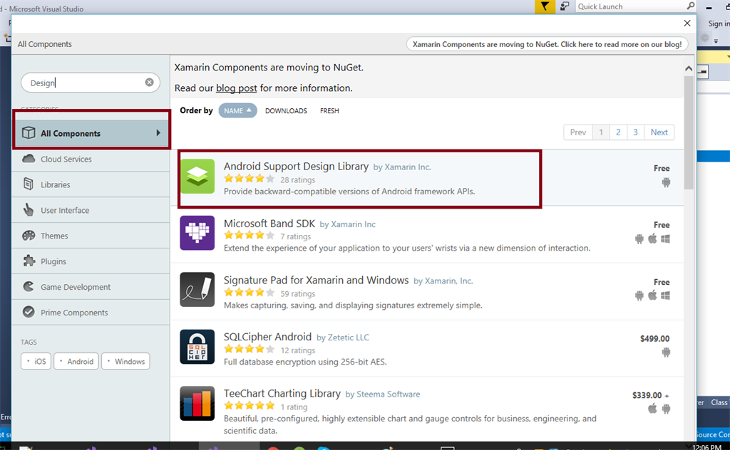 - Now search "Design Library" in searchbox and select "Android Support Design Library" from result.