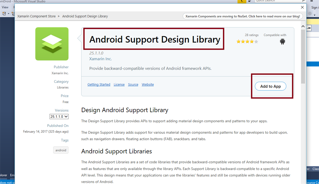 - Then click on "Add to App" for install the "Android Support Design Library".