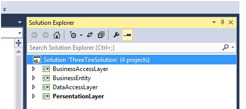 Create a blank solution. In this blank solution, add three class projects with the names: Data Access Layer, Business Access Layer and Business Entity.